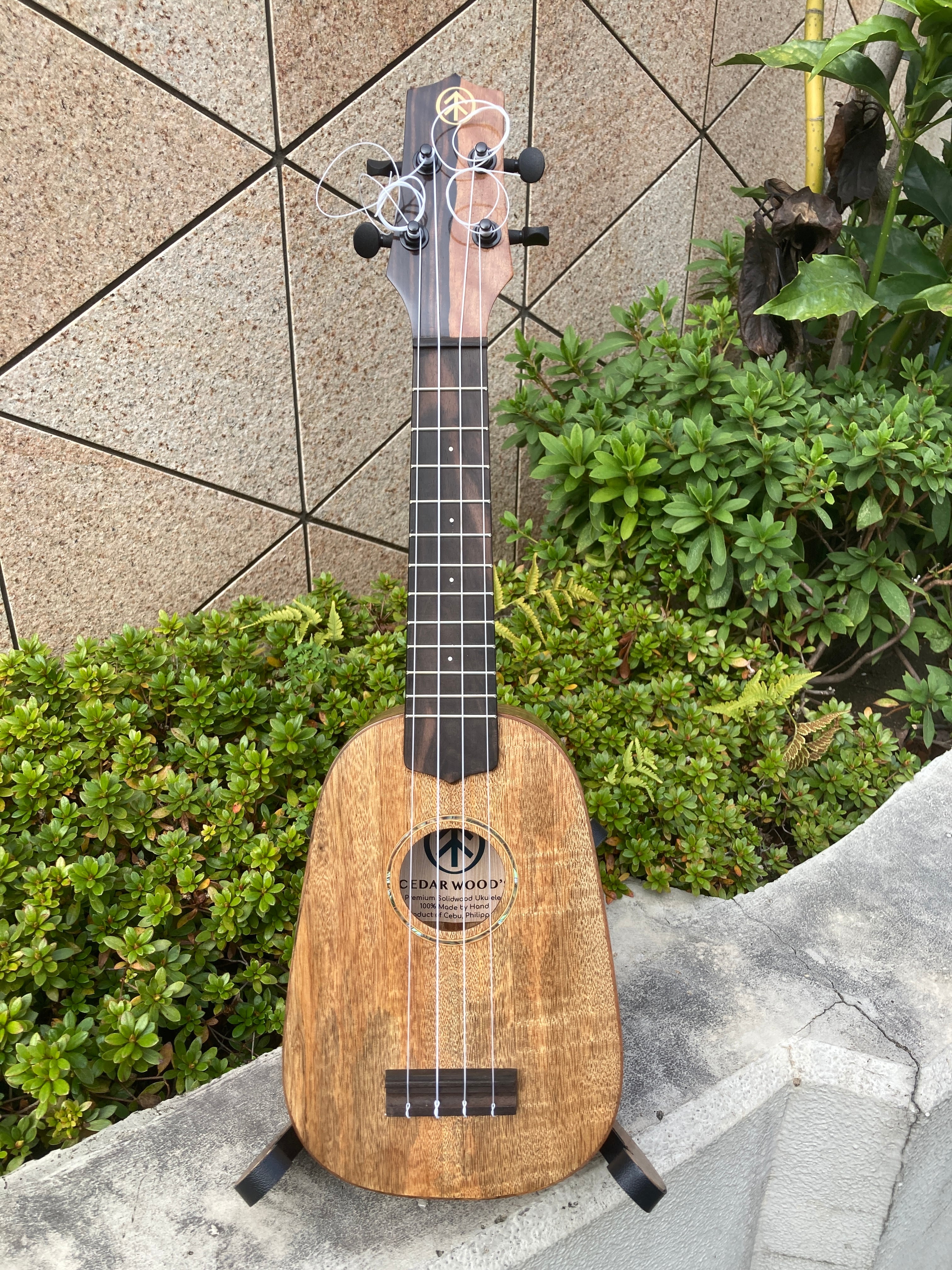 セブ島原産の貴重なマンゴ材を贅沢に使った単板ソプラノウクレレ、ハワイアンコアに似たコロコロとした温もりのある音が特徴です。南国ムードいっぱいのパイナップルシェイプ。サウンドホールのシェルインレイが可愛らしいアクセントになっています。